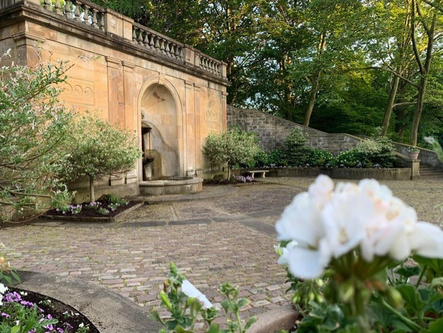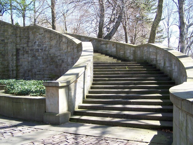 The Late Renaissance design has wide walkways and two large Renaissance fountains, one that is modeled after the fountain in Villa Medici in Rome with two sweeping staircases leading down to a lower-level amphitheater and a second large Renaissance fountain.