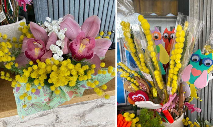 As gifts for the special women in one’s life, florists offer bouquets of all sizes highlighted with vibrant yellow mimosa for the March 8 holiday. Mimosa sprays also honor deceased loved ones.