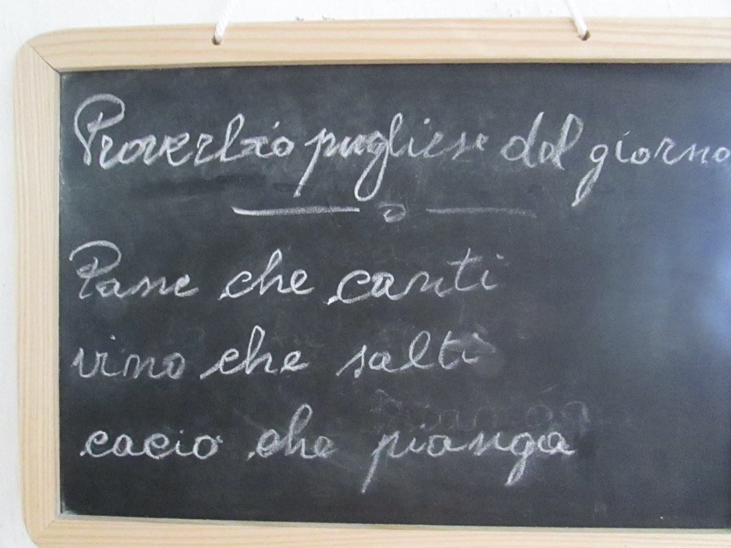 Figura 12 - Sign in a Pugliese deli that embodies how Italians relate to food. Proverbio pugliese del giorno. Bread that sings, Wine that jumps, cheese that cries.