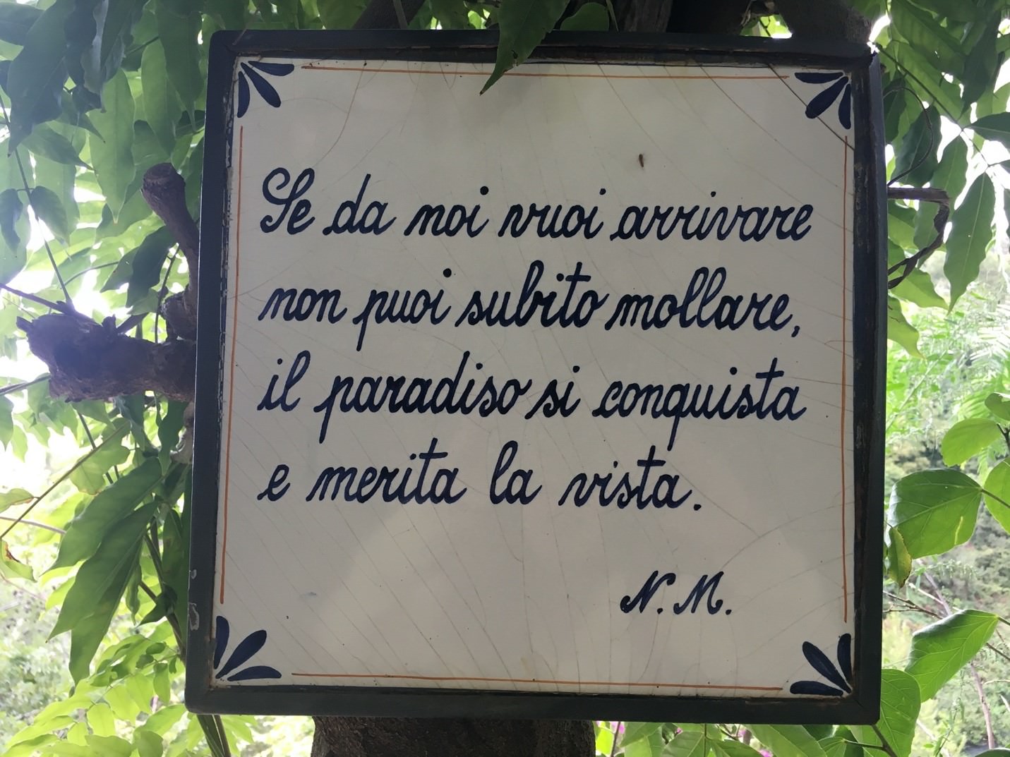 Figura 4 - Minori, on the Amalfi coast. High up on the hillside overlooking the Mediterranean is Agriturismo Villa Maria, a lemon farm. At the bottom of the many stairs that lead up to it is this sign, “Don’t give up climbing all those stairs because you will find paradise with an incredible view.” The 50 steps to the Agriturismo from where we parked our car was nothing compared to the nearly 500 steps from Villa Maria down to Minori and the sea!