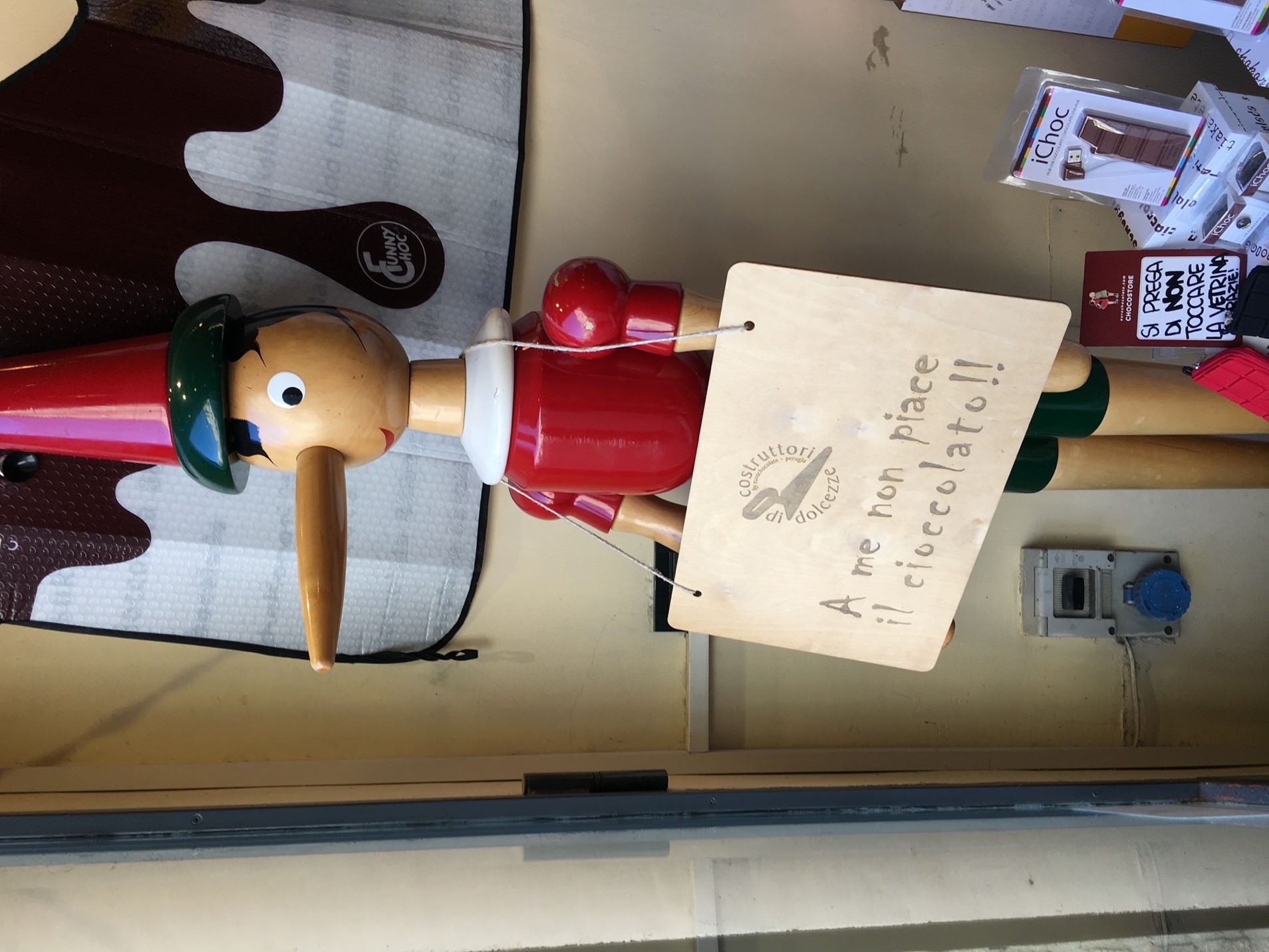 Figura 7 - Where else but in Perugia, Umbria, Italy, will you find the best chocolates in the world and my favorite character, Pinocchio. Surely, he is lying when he says he does not like chocolate!!