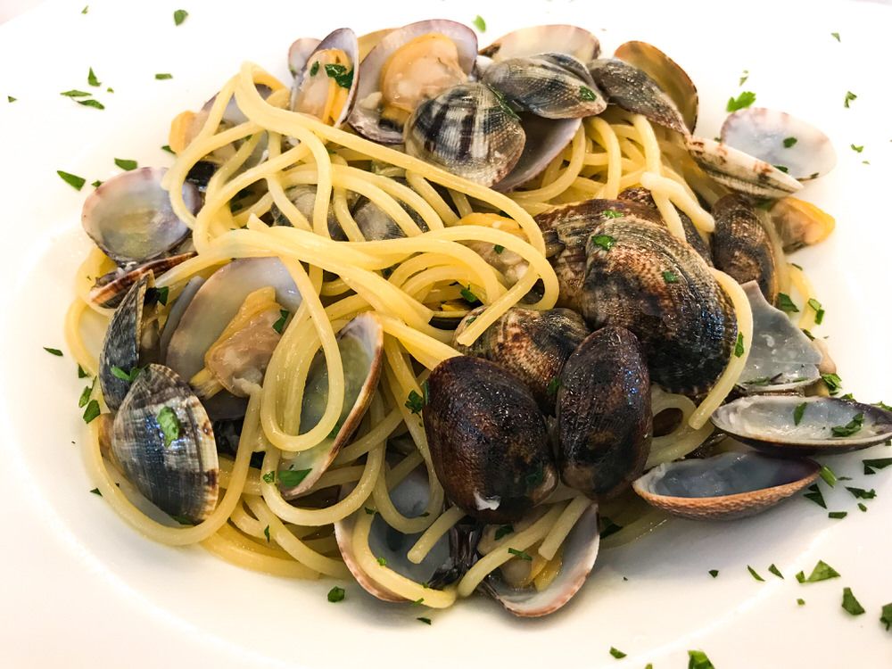Clean and rinse the fresh clams thoroughly (discard any that are open and do not close). In a large pot/pan, gently sauté 3 4 cloves of garlic (sliced) and a pinch of red pepper flakes in good olive oil until fragrant (but not browned). Add about ½ cup of dry white wine and bring to a gentle boil, then add the clams, cover, and cook until all (or almost all) clams open (about 5 7 minutes). Discard any unopened clams. Meanwhile, cook spaghetti in salted boiling water until al dente, reserving about ½ cup of the pasta cooking water. Drain the pasta and add into the clam mixture along with a handful of chopped fresh parsley and a splash of the reserved pasta water to loosen the sauce. Toss gently so the pasta takes up the clam juices. Finish with a drizzle of extra‐virgin olive oil, a bit of fresh parsley, and optionally lemon zest or a squeeze of lemon. Serve immediately.