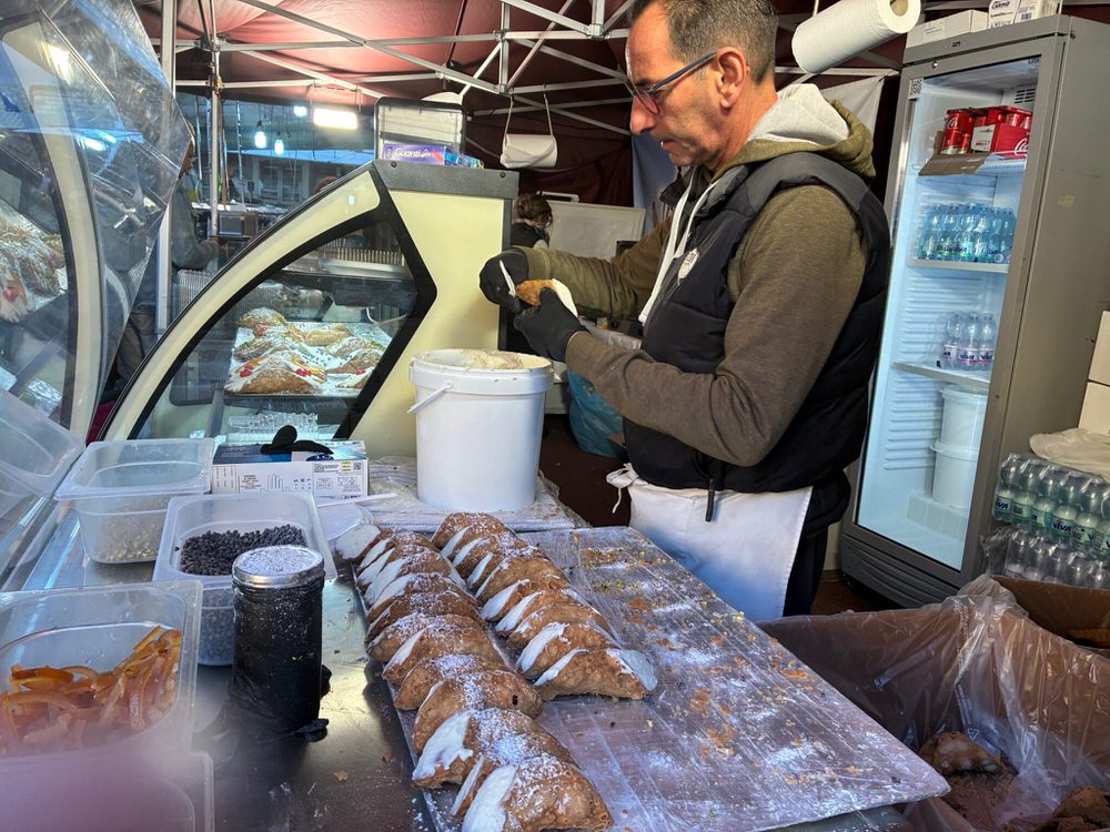 Just around the corner under the Basilica’s flying buttresses, cannaresi (people from Cannara) sold their famed onions. At another booth, Sicilian sweets enticed buyers and you could cannoli being filled with fresh ricotta di pecora.