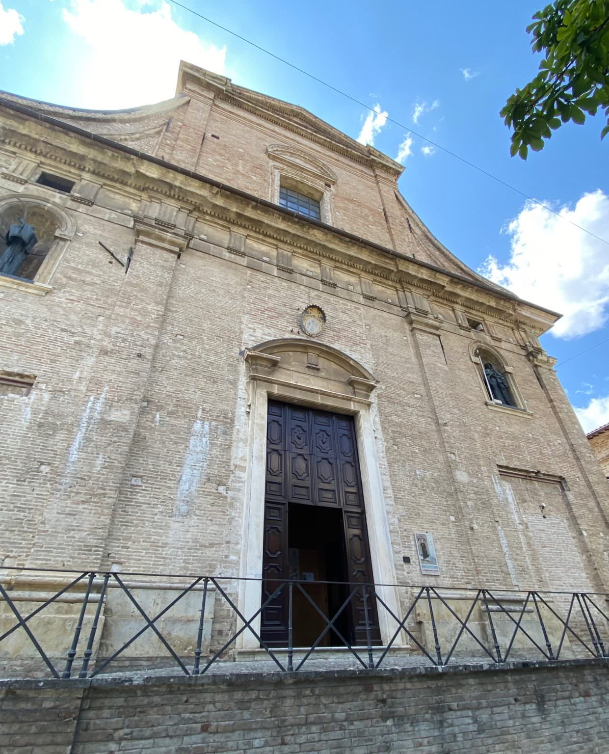 The church, of severe classical design, was built in the early 17th century on design of Valerio Martelli, a Perugian architect and honorary citizen of Montefalco. A chapel in the right transept is the only remnant of a pre-existing church inaugurated in 1430. The chapel holds the silver tomb displaying the body of St. Clare of the Cross (1268 – 1308), beloved saint of Montefalco. Above the tomb hangs a painting of 1600 depicting St. Clare of the Cross praying as the Lord appears to her carrying His Cross with the committente (the person who commissioned the art) kneeling piously, hands folded in the corner.