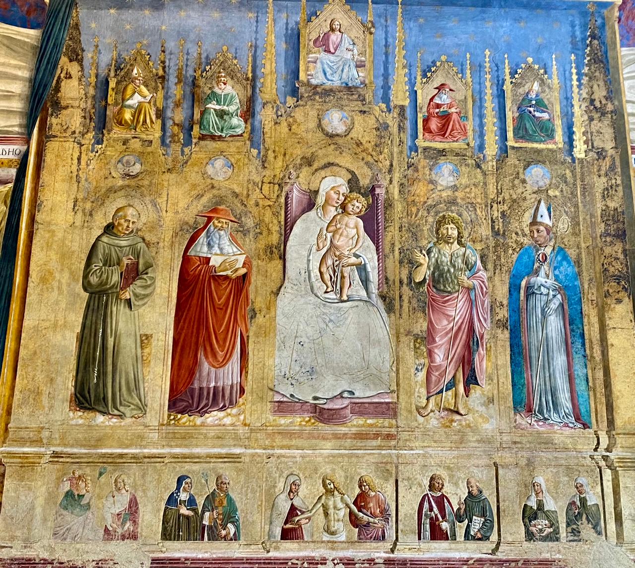 Before you leave the Cappella di San Girolamo, San Bernardino appears once again, frescoed by Gozzoli in the round arch enclosing the space. Angels hold a rich and elegant tapestry, backdropping the bald saint.
